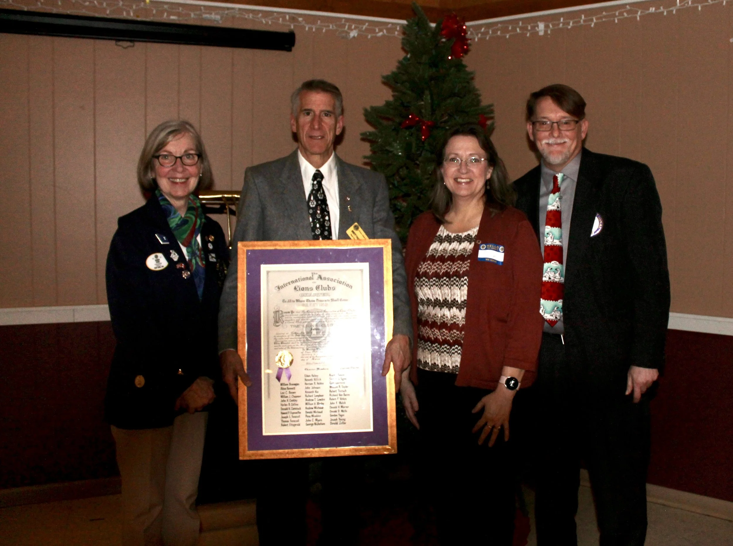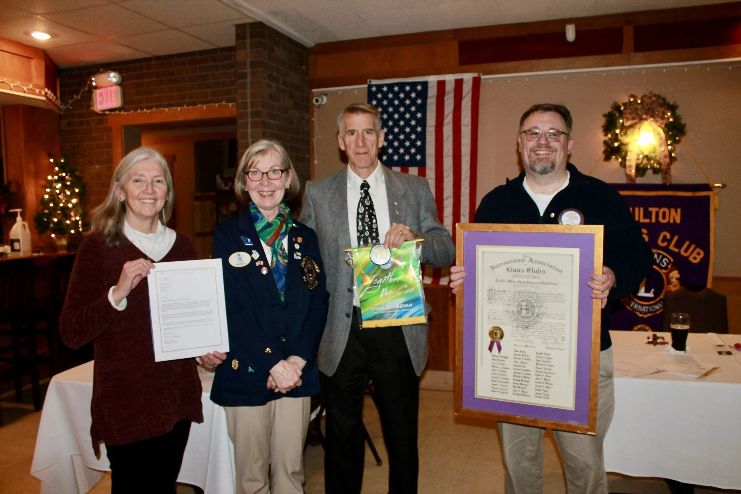 Sheree Vora, district governor for NY Lions District 20-Y, second from left, presented a patch, banner, and certificate of recognition to the Fulton Lions Club for their 70th anniversary. Joining her, above, from left are Sue Tallents, wife of club President Brett Tallents, Vora, Brett Tallents, and David Guyer, immediate past president who is holding the club’s original 1952 charter.